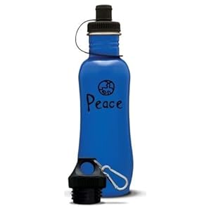 Product Description : 32 oz Blue Stainless Steel "(I Am) Peace" Bottle. Includes sports cap & loop cap w/carbineer. Holds even more water! Made from leach free 18/8 food grade stainless steel, durable, reusable & lightweight. Fits in most bike bottle holders and car cup holders.