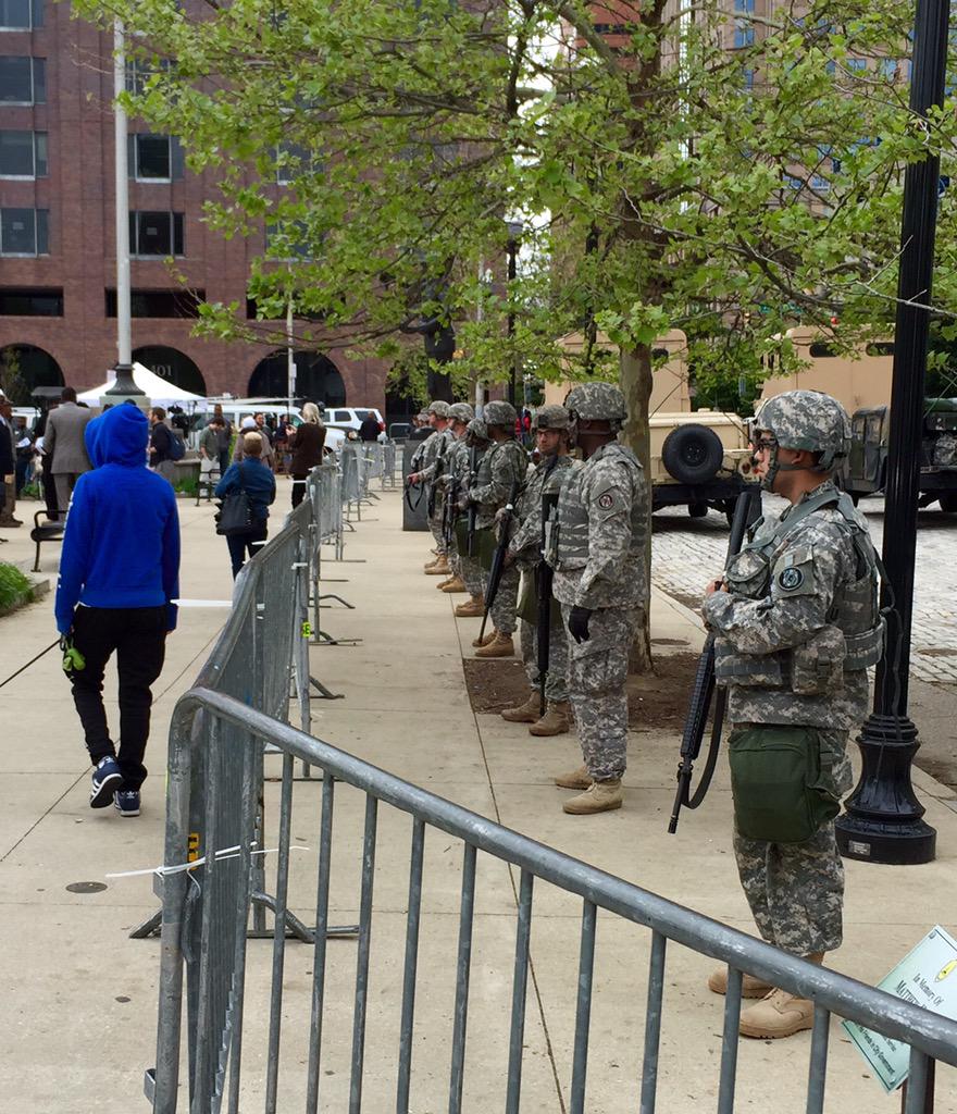 @ryanobles tweeted: The National Guard troops at City Hall quickly sprang to their post as Mosby announced the charges. #Baltimore